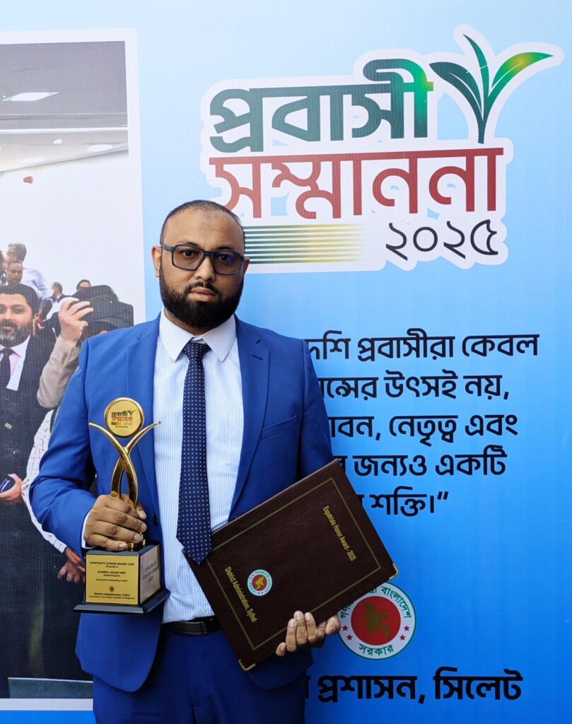 গত শনিবার(২৭ ডিসেম্বর) সিলেটের জাতীয় কবি কাজী নজরুল অডিটোরিয়ামে অনুষ্ঠিত অনুষ্ঠানে ডাক ও টেলিযোগাযোগ মন্ত্রণালয়ের সচিব আব্দুল নাসির তাঁর হাতে এই সম্মাননা তুলে দেন। দীর্ঘদিন প্রবাসে তার নেতৃত্ব, সংগঠনমূলক কার্যক্রম এবং জনস্বার্থে নিবেদিত কাজকে রাষ্ট্র গুরুত্ব দিয়ে স্বীকৃতি দিয়েছে।